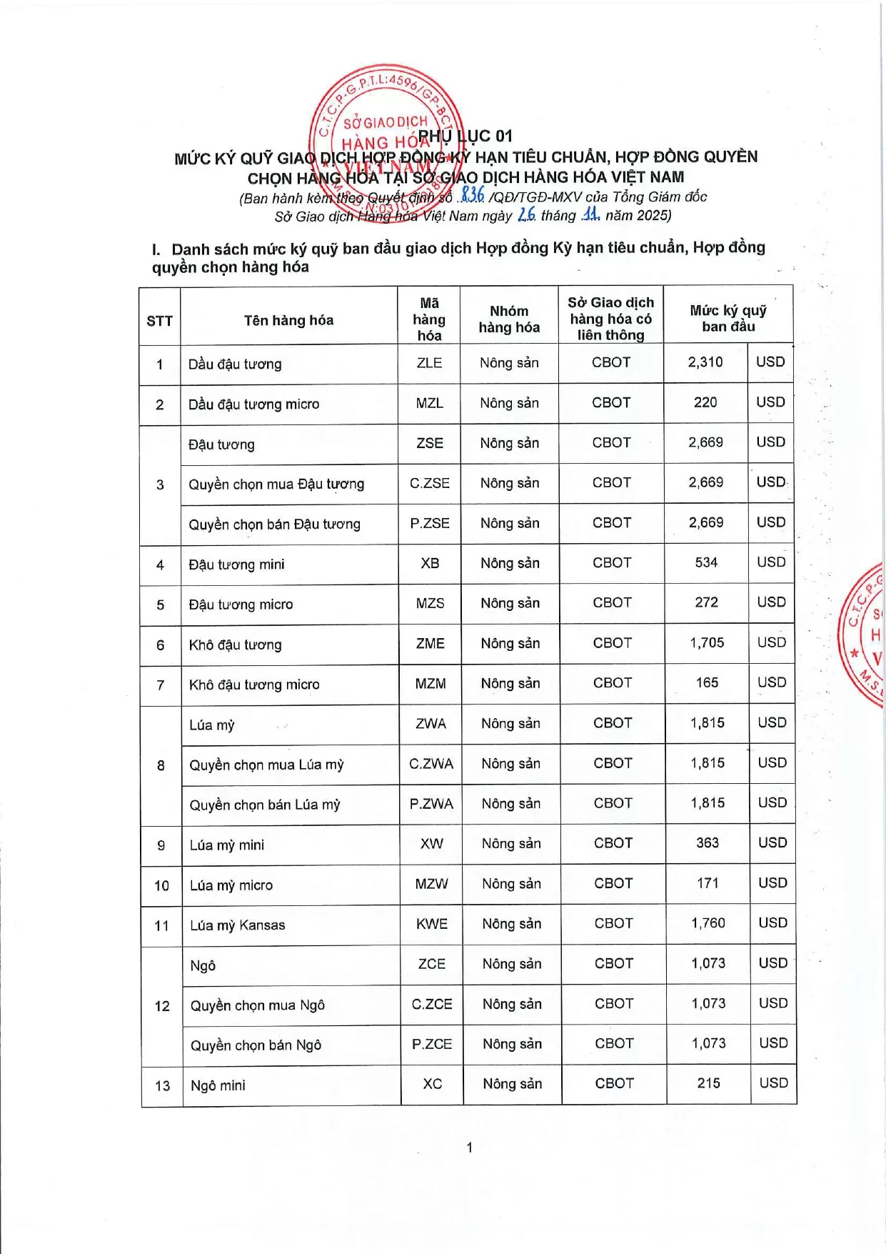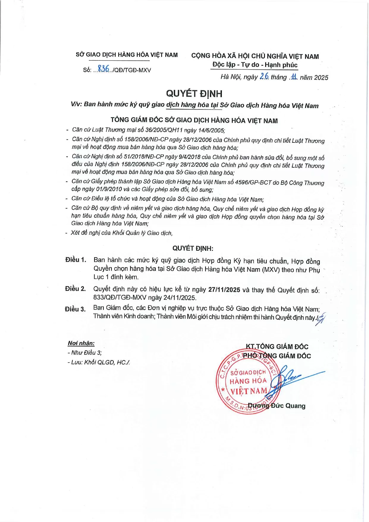 Áp dụng từ phiên giao dịch ngày 27/11/2025 và thay thế cho Quyết định số: 833/QĐ/TGĐ-MXV ngày 24/11/2025.