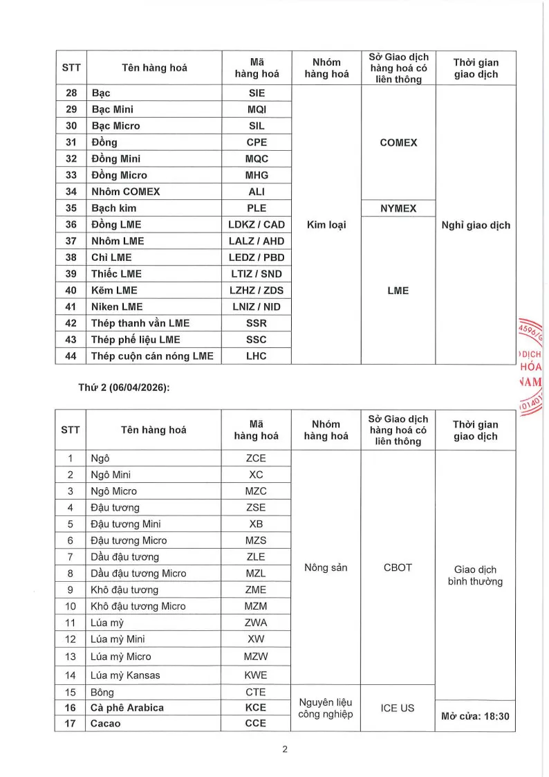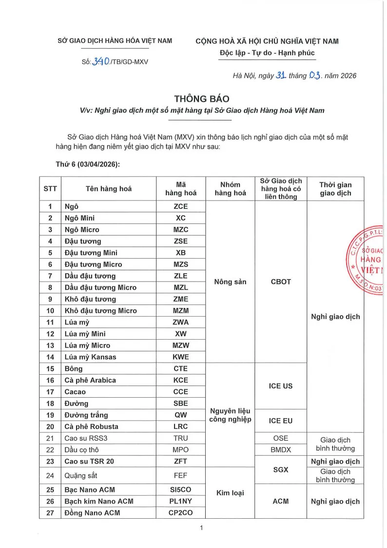 Theo quyết định của Sở Giao dịch hàng hóa Việt Nam (MXV), Công ty Fintex Investment., JSC gửi đến Quý Khách hàng Thông báo số 340/TB/TGĐ-MXV ngày 31/03/2026. V/v Lịch Nghỉ giao dịch một số mặt hàng tại Sở Giao dịch Hàng hóa Việt Nam (MXV).