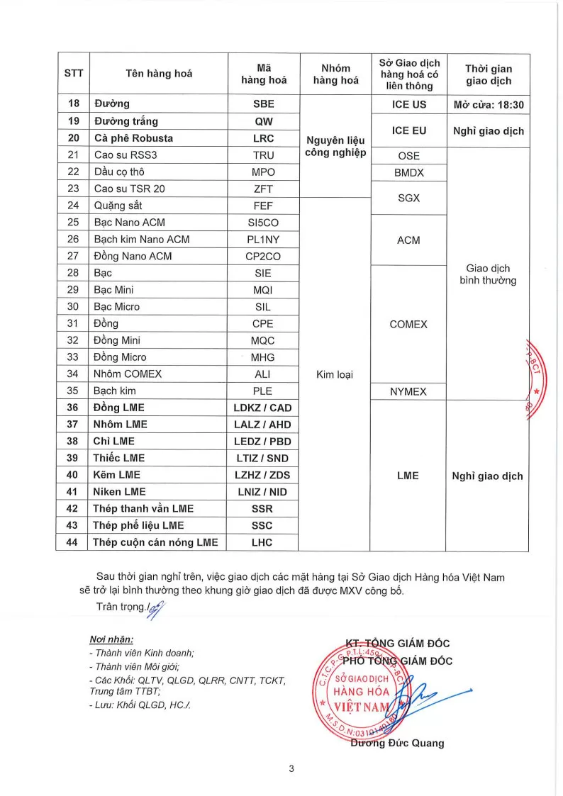 Sau thời gian nghỉ trên, việc giao dịch các mặt hàng tại Sở Giao dịch Hàng hóa Việt Nam (MXV) sẽ trở lại bình thường theo khung giờ đã được MXV công bố.